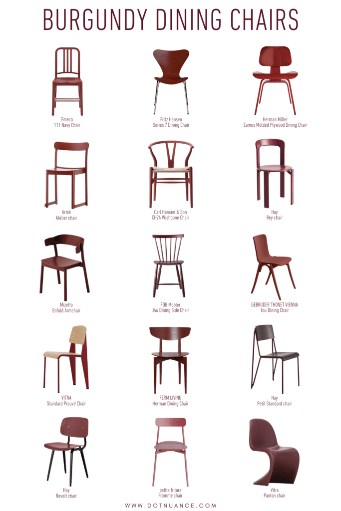 For clean Scandinavian lines, I keep reaching for the CH24 Wishbone Chair from Carl Hansen & Søn or the Series 7 by Fritz Hansen. Both are light in structure, which is works best with burgundy.